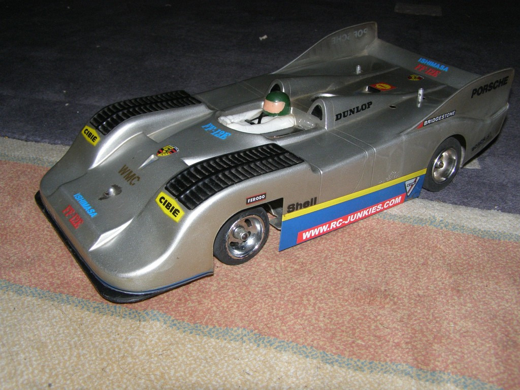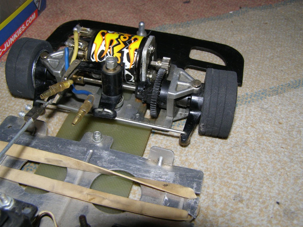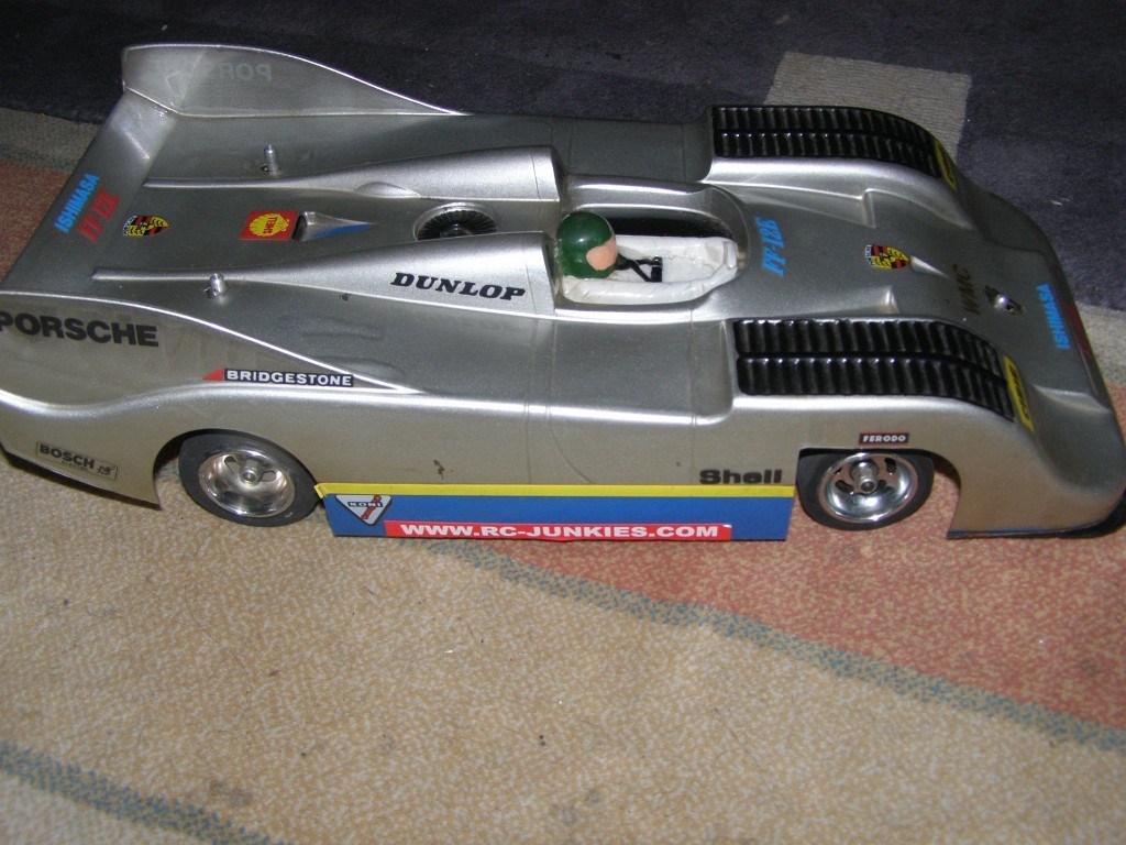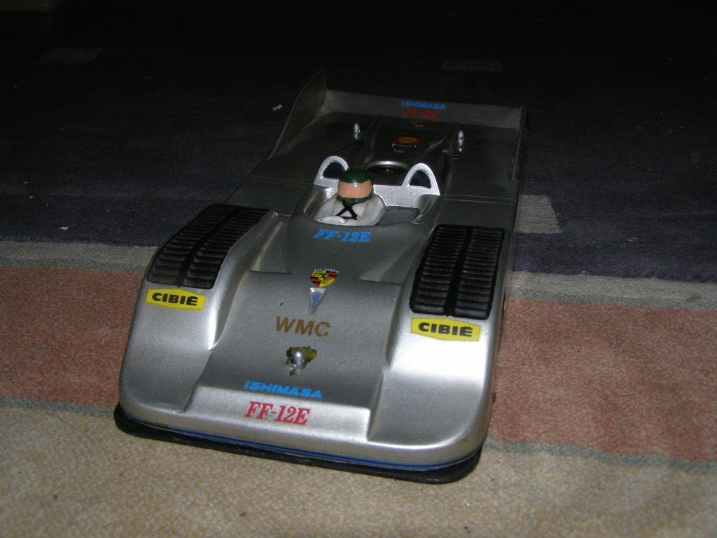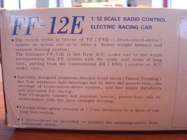 This 1/12th Ishimasa FF12E chassis from 1979, world’s first front wheel drive rc car. It came with a couple of different body types. There was a Porsche 917, the Savanna RX-7 a Renault Mirage. There may have been more.