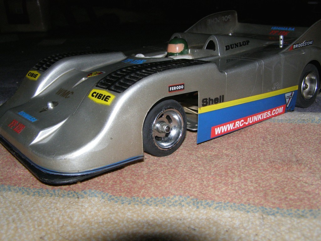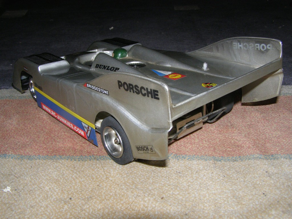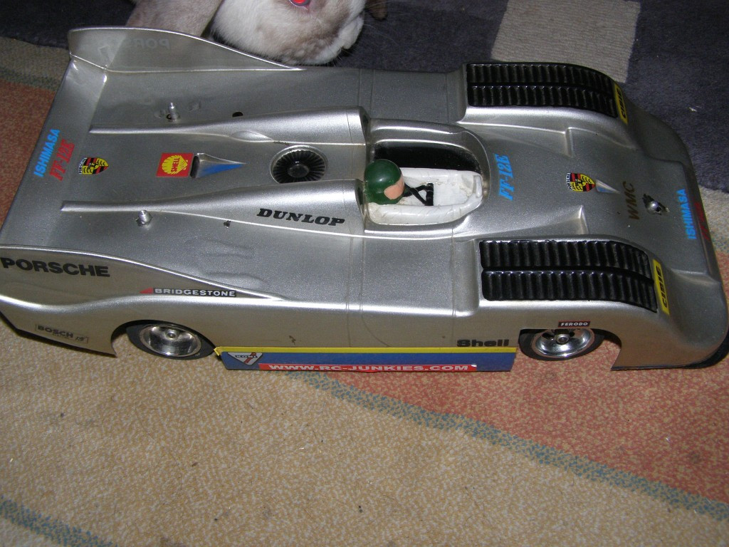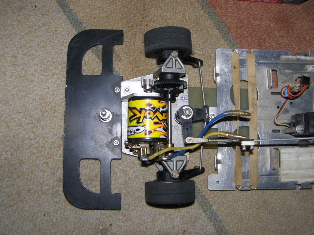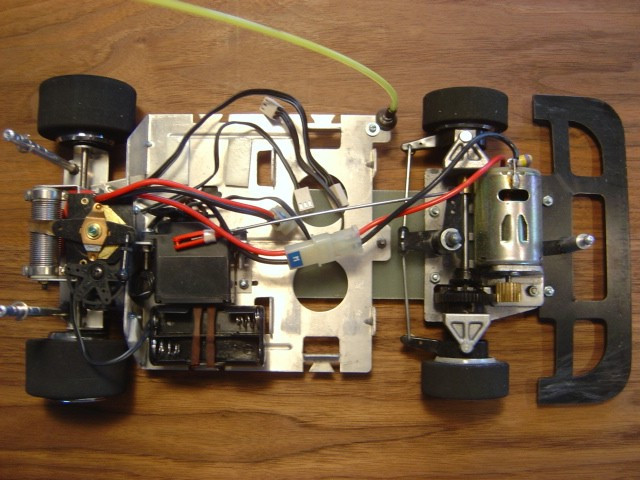 This 1/12th Ishimasa FF12E chassis from 1979, world’s first front wheel drive rc car. It came with a couple of different body types. There was a Porsche 917, the Savanna RX-7 a Renault Mirage. There may have been more.