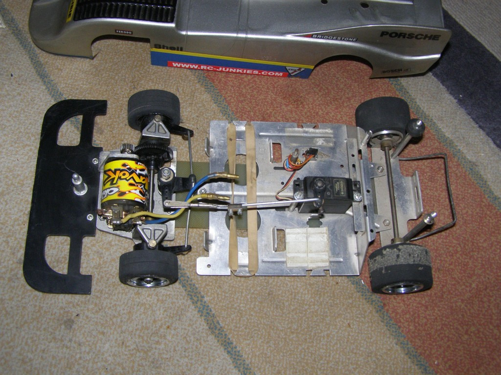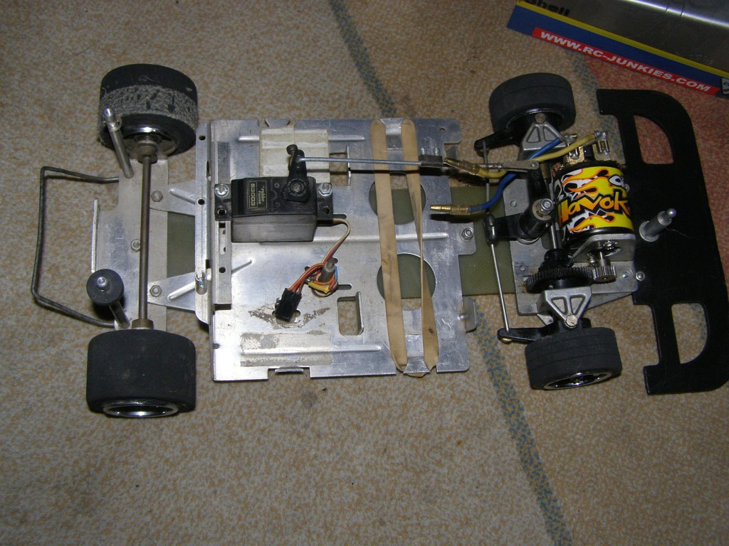 The front drive unit consists of a large aluminum casting, which combines a 5mm base plate and the two arms in one component. It is accordingly heavy. The uprights are designed in plastic and carry ball bearings. On the epoxy chassis is a low-lying aluminum radio plate mounted, which is decoupled by rubber grommets.